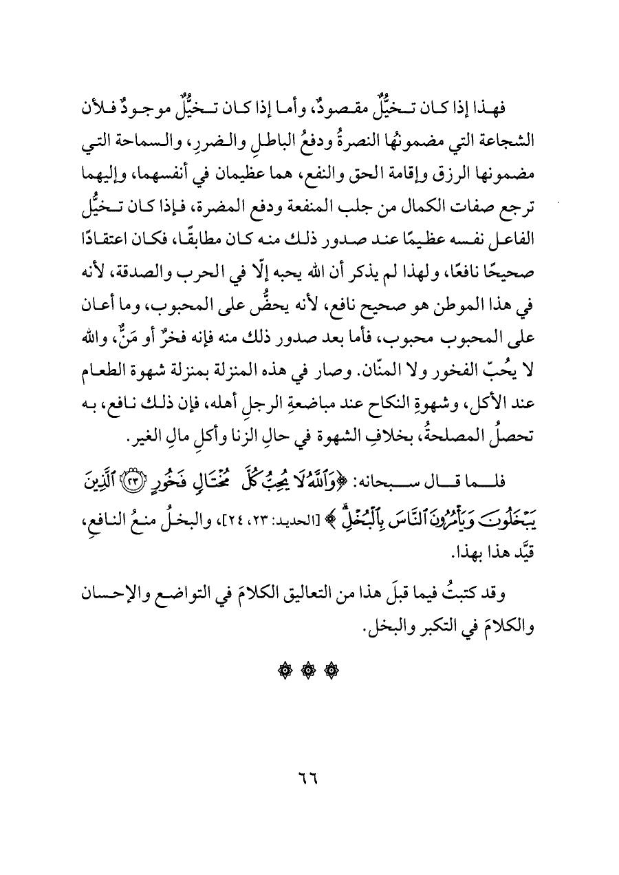 فهذا إذا كان تخيُّلٌ مقصودٌ، وأما إذا كان تخيُّلٌ موجودٌ فلأن الشجاعة التي مضمونُها النصرةُ ودفعُ الباطلِ والضررِ، والسماحة التي مضمونها الرزق وإقامة الحق والنفع، هما عظيمان في أنفسهما، وإليهما ترجع صفات الكمال من جلب المنفعة ودفع المضرة، فإذا كان تخيُّل الفاعل نفسه عظيمًا عند صدور ذلك منه كان مطابقًا، فكان اعتقادًا صحيحًا نافعًا، ولهذا لم يذكر أن الله يحبه إلّا في الحرب والصدقة، لأنه في هذا الموطن هو صحيح نافع، لأنه يحضُّ على المحبوب، وما أعان على المحبوب محبوب، فأما بعد صدور ذلك منه فإنه فخرٌ أو مَنٌّ، والله لا يُحبّ الفخور ولا المنّان. وصار في هذه المنزلة بمنزلة شهوة الطعام عند الأكل، وشهوةِ النكاح عند مباضعةِ الرجلِ أهله، فإن ذلك نافع، به تحصلُ المصلحةُ، بخلافِ الشهوة في حالِ الزنا وأكلِ مالِ الغير.