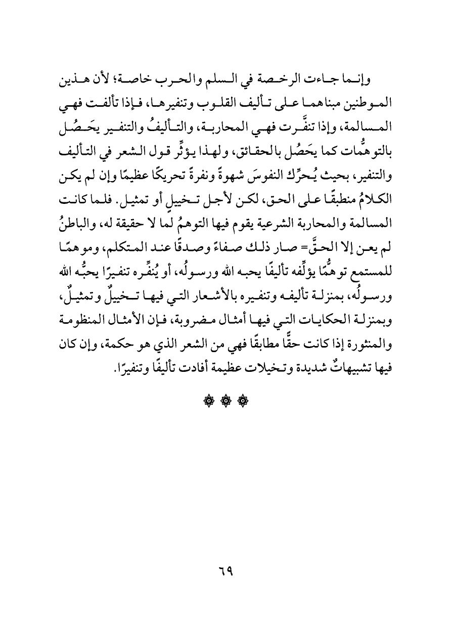 وإنما جاءت الرخصة في السلم والحرب خاصة؛ لأن هذين الموطنين مبناهما على تأليف القلوب وتنفيرها، فإذا تألفت فهي المسالمة، وإذا تنفَّرت فهي المحاربة، والتأليفُ والتنفير يَحصُل بالتوهُّمات كما يَحصُل بالحقائق، ولهذا يؤثِّر قول الشعر في التأليف والتنفير، بحيث يُحرِّك النفوسَ شهوةً ونفرةً تحريكًا عظيمًا وإن لم يكن الكلامُ منطبقًا على الحق، لكن لأجل تخييلٍ أو تمثيل. فلما كانت المسالمة والمحاربة الشرعية يقوم فيها التوهمُ لما لا حقيقة له، والباطنُ لم يعن إلا الحقَّ= صار ذلك صفاءً وصدقًا عند المتكلم، وموهمًا للمستمع توهُّمًا يؤلِّفه تأليفًا يحبه الله ورسولُه، أو يُنفِّره تنفيرًا يحبُّه الله ورسولُه، بمنزلة تأليفه وتنفيره بالأشعار التي فيها تخييلٌ وتمثيلٌ، وبمنزلة الحكايات التي فيها أمثال مضروبة، فإن الأمثال المنظومة والمنثورة إذا كانت حقًّا مطابقًا فهي من الشعر الذي هو حكمة، وإن كان فيها تشبيهاتٌ شديدة وتخيلات عظيمة أفادت تأليفًا وتنفيرًا.