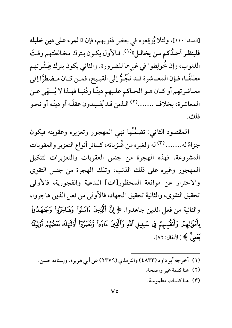 المقصود الثاني: تضمُّنُها نهي المهجور وتعزيره وعقوبته فيكون جزاءً له ....... (¬٣) له ولغيره من ضُرَبائه، كسائر أنواع التعزير والعقوبات المشروعة. فهذه الهجرة من جنس العقوبات والتعزيرات لتنكيل المهجور وغيره على ذلك الذنب، وتلك الهجرة من جنس التقوى والاحتراز عن مواقعة المحظور [ات] البدعية والفجورية، فالأولى تحقيق التقوى، والثانية تحقيق الجهاد، فالأولى من فعل الذين هاجروا، والثانية من فعل الذين جاهدوا. {إِنَّ الَّذِينَ آمَنُوا وَهَاجَرُوا وَجَاهَدُوا بِأَمْوَالِهِمْ وَأَنْفُسِهِمْ فِي سَبِيلِ اللَّهِ وَالَّذِينَ آوَوْا وَنَصَرُوا أُولَئِكَ بَعْضُهُمْ أَوْلِيَاءُ بَعْضٍ} [الأنفال: ٧٢].