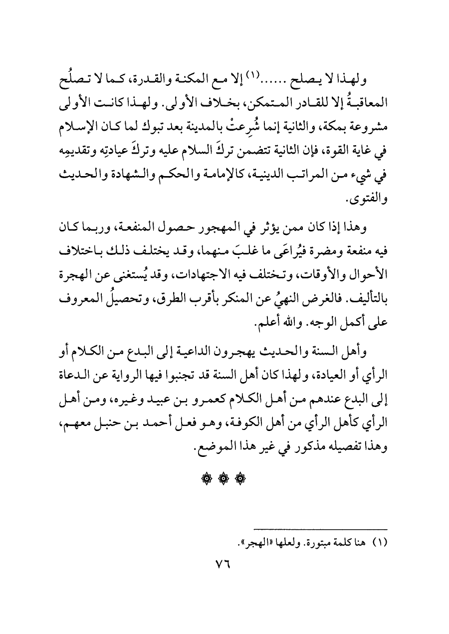ولهذا لا يصلح ...... (¬١) إلا مع المكنة والقدرة، كما لا تصلُح المعاقبةُ إلا للقادر المتمكن، بخلاف الأولى. ولهذا كانت الأولى مشروعة بمكة، والثانية إنما شُرِعتْ بالمدينة بعد تبوك لما كان الإسلام في غاية القوة، فإن الثانية تتضمن تركَ السلام عليه وتركَ عيادتِه وتقديمِه في شيء من المراتب الدينية، كالإمامة والحكم والشهادة والحديث والفتوى.