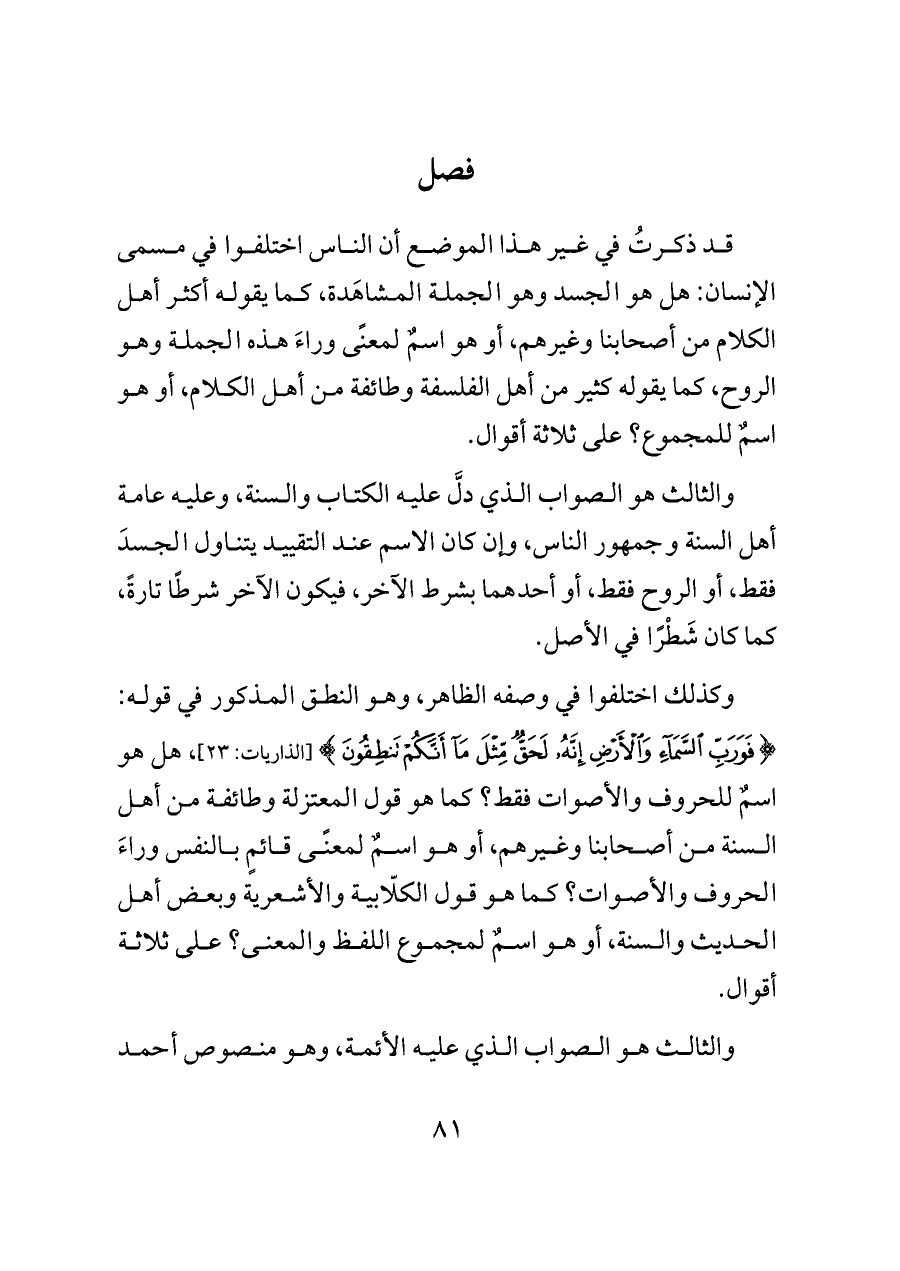 وكذلك اختلفوا في وصفه الظاهر، وهو النطق المذكور في قوله: {فَوَرَبِّ السَّمَاءِ وَالْأَرْضِ إِنَّهُ لَحَقٌّ مِثْلَ مَا أَنَّكُمْ تَنْطِقُونَ} [الذاريات: ٢٣]، هل هو اسمٌ للحروف والأصوات فقط؟ كما هو قول المعتزلة وطائفة من أهل السنة من أصحابنا وغيرهم، أو هو اسمٌ لمعنًى قائمٍ بالنفس وراءَ الحروف والأصوات؟ كما هو قول الكلّابية والأشعرية وبعض أهل الحديث والسنة، أو هو اسمٌ لمجموع اللفظ والمعنى؟ على ثلاثة أقوال.