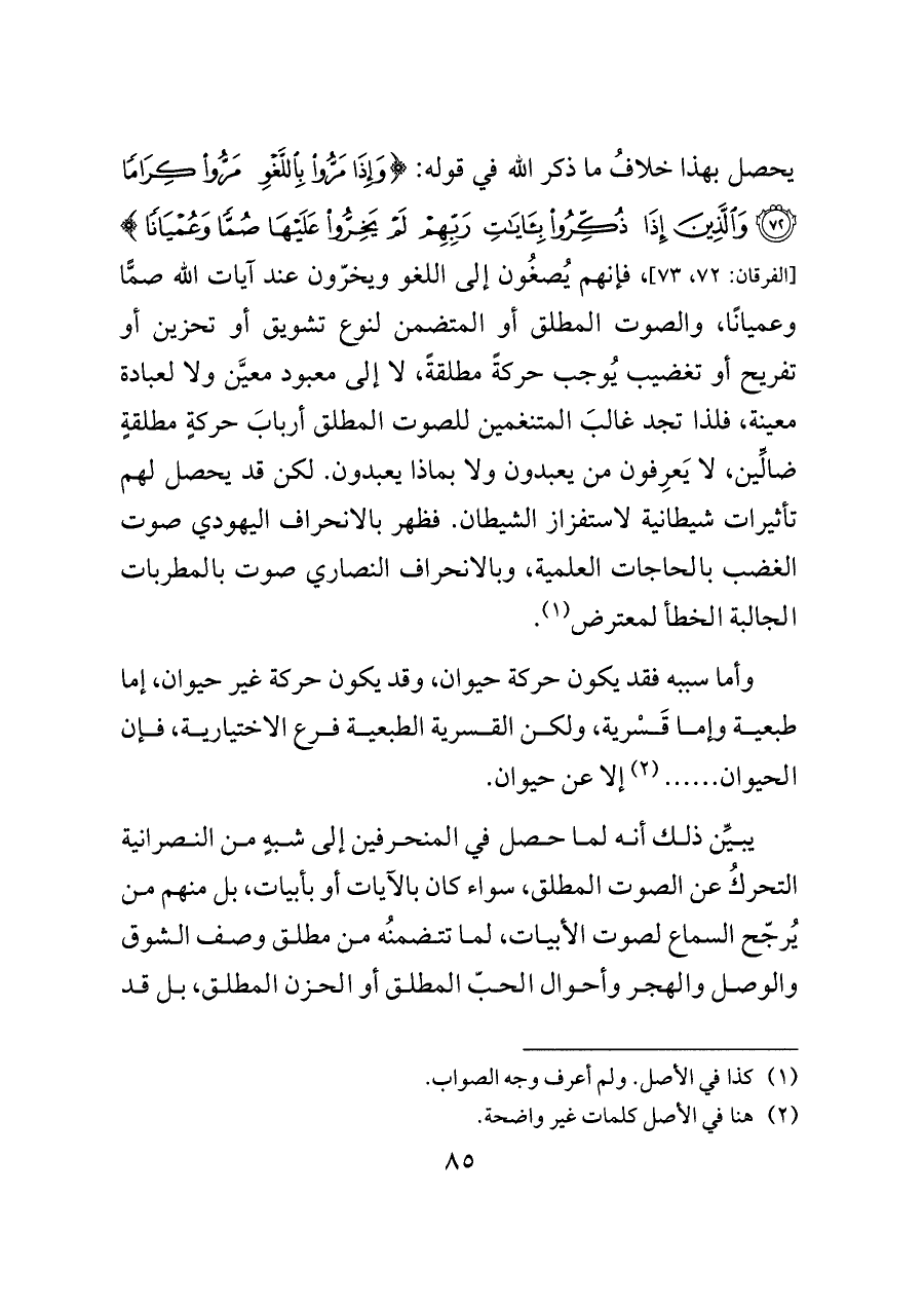 يحصل بهذا خلافُ ما ذكر الله في قوله: {وَإِذَا مَرُّوا بِاللَّغْوِ مَرُّوا كِرَامًا (٧٢) وَالَّذِينَ إِذَا ذُكِّرُوا بِآيَاتِ رَبِّهِمْ لَمْ يَخِرُّوا عَلَيْهَا صُمًّا وَعُمْيَانًا} [الفرقان: ٧٢، ٧٣]، فإنهم يُصغُون إلى اللغو ويخرّون عند آيات الله صمًّا وعميانًا، والصوت المطلق أو المتضمن لنوع تشويق أو تحزين أو تفريح أو تغضيب يُوجب حركةً مطلقةً، لا إلى معبود معيَّن ولا لعبادة معينة، فلذا تجد غالبَ المتنغمين للصوت المطلق أربابَ حركةٍ مطلقةٍ ضالِّين، لا يَعرِفون من يعبدون ولا بماذا يعبدون. لكن قد يحصل لهم تأثيرات شيطانية لاستفزاز الشيطان. فظهر بالانحراف اليهودي صوت الغضب بالحاجات العلمية، وبالانحراف النصاري صوت بالمطربات الجالبة الخطأ لمعترض (¬١).