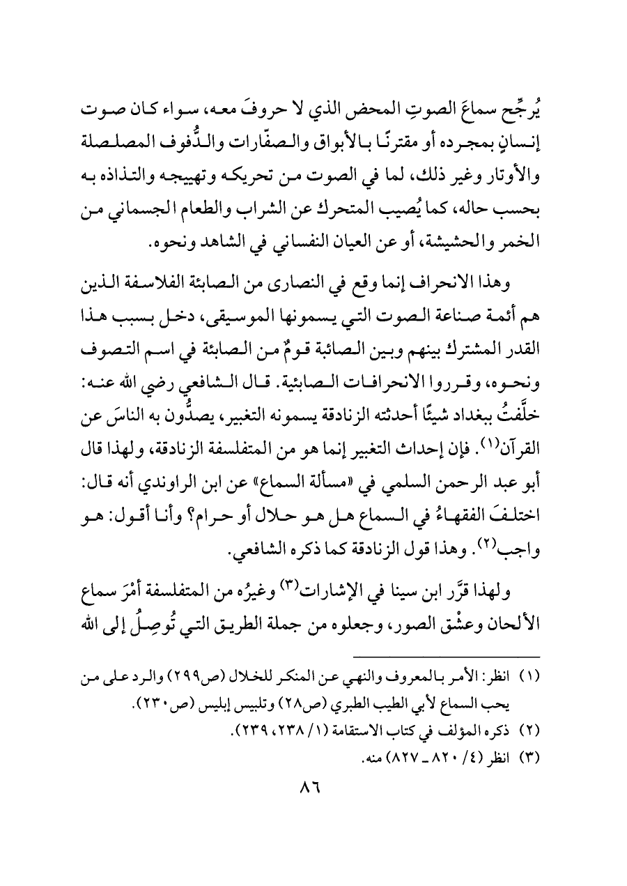(¬١) انظر: الأمر بالمعروف والنهي عن المنكر للخلال (ص ٢٩٩) والرد على من يحب السماع لأبي الطيب الطبري (ص ٢٨) وتلبيس إبليس (ص ٢٣٠).