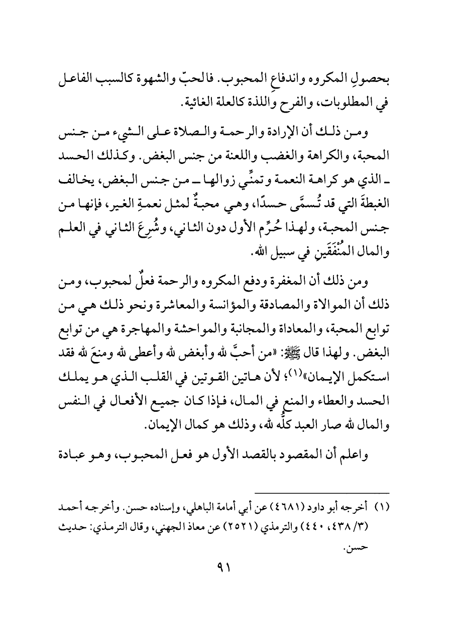ومن ذلك أن الإرادة والرحمة والصلاة على الشيء من جنس المحبة، والكراهة والغضب واللعنة من جنس البغض. وكذلك الحسد ــ الذي هو كراهة النعمة وتمنِّي زوالِها ــ من جنس البغض، يخالف الغبطةَ التي قد تُسمَّى حسدًا، وهي محبةٌ لمثل نعمةِ الغير، فإنها من جنس المحبة، ولهذا حُرِّم الأول دون الثاني، وشُرِعَ الثاني في العلم والمال المُنْفَقَينِ في سبيل الله.