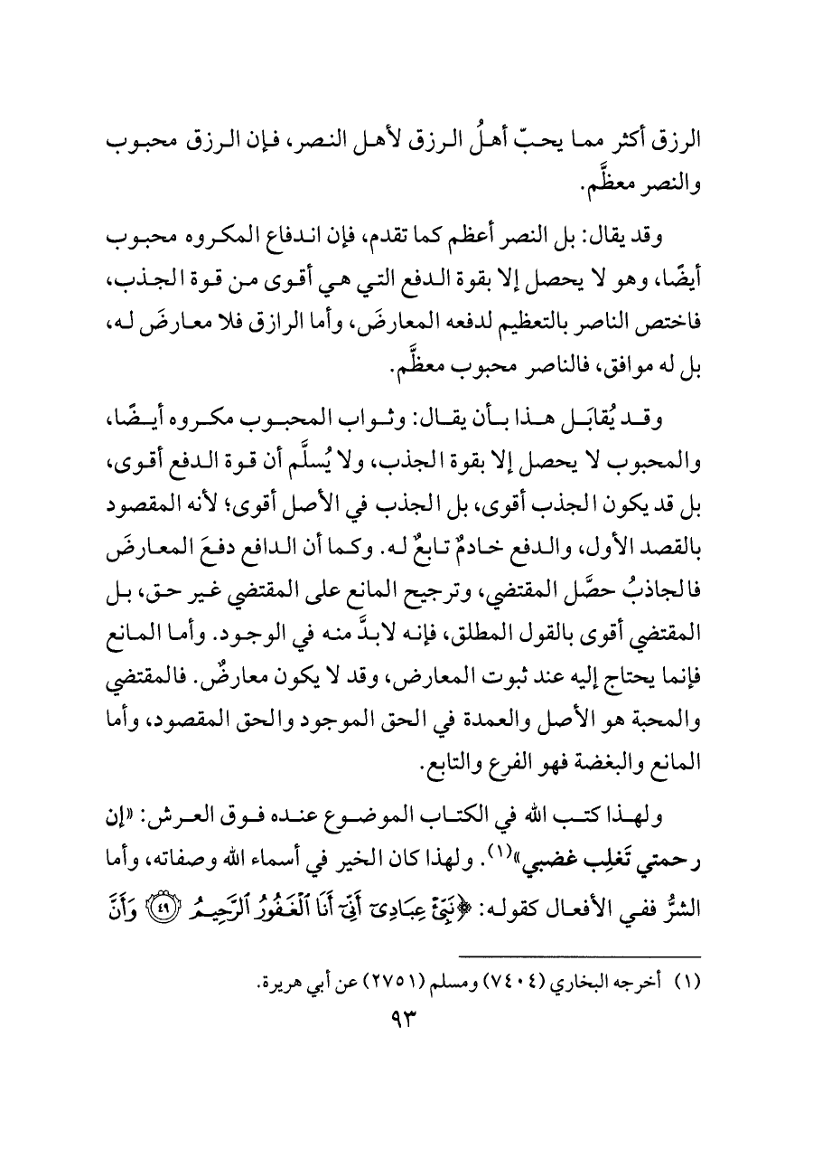 وقد يُقابَل هذا بأن يقال: وثواب المحبوب مكروه أيضًا، والمحبوب لا يحصل إلا بقوة الجذب، ولا يُسلَّم أن قوة الدفع أقوى، بل قد يكون الجذب أقوى، بل الجذب في الأصل أقوى؛ لأنه المقصود بالقصد الأول، والدفع خادمٌ تابعٌ له. وكما أن الدافع دفعَ المعارضَ فالجاذبُ حصَّل المقتضي، وترجيح المانع على المقتضي غير حق، بل المقتضي أقوى بالقول المطلق، فإنه لابدَّ منه في الوجود. وأما المانع فإنما يحتاج إليه عند ثبوت المعارض، وقد لا يكون معارضٌ. فالمقتضي والمحبة هو الأصل والعمدة في الحق الموجود والحق المقصود، وأما المانع والبغضة فهو الفرع والتابع.
