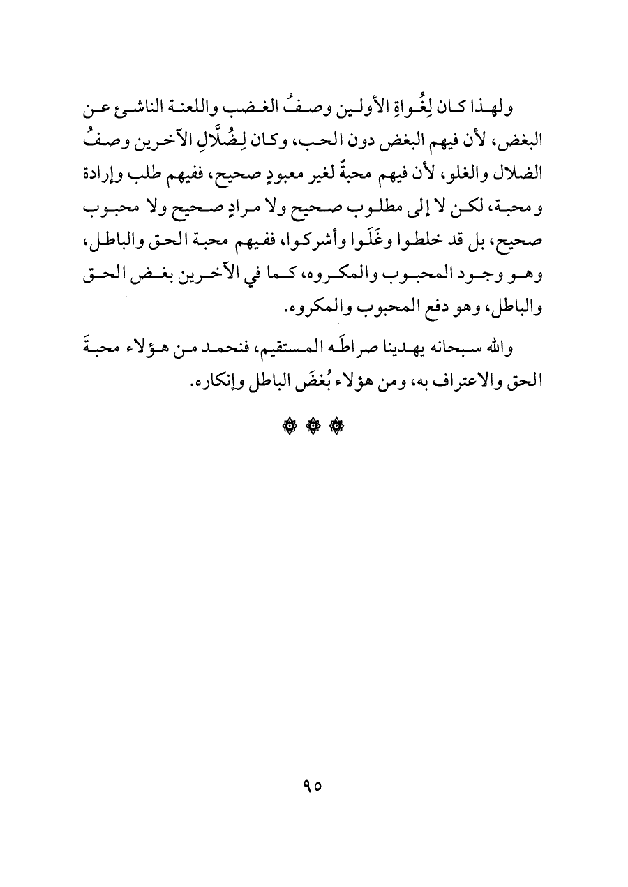 ولهذا كان لِغُواةِ الأولين وصفُ الغضب واللعنة الناشئ عن البغض، لأن فيهم البغض دون الحب، وكان لِضُلَّالِ الآخرين وصفُ الضلال والغلو، لأن فيهم محبةً لغير معبودٍ صحيح، ففيهم طلب وإرادة ومحبة، لكن لا إلى مطلوب صحيح ولا مرادٍ صحيح ولا محبوب صحيح، بل قد خلطوا وغَلَوا وأشركوا، ففيهم محبة الحق والباطل، وهو وجود المحبوب والمكروه، كما في الآخرين بغض الحق والباطل، وهو دفع المحبوب والمكروه.