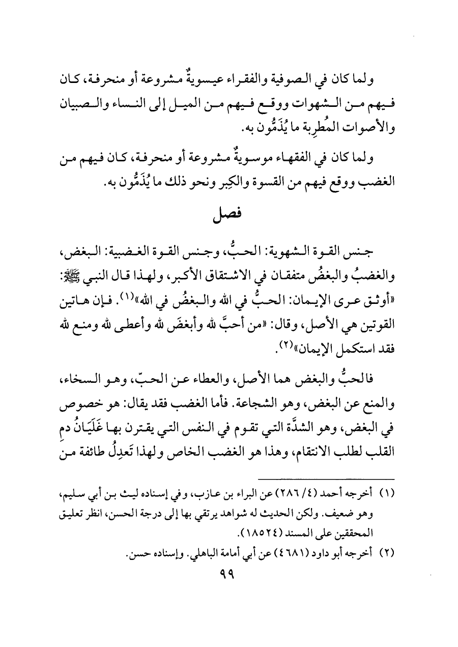 جنس القوة الشهوية: الحبُّ، وجنس القوة الغضبية: البغض، والغضبُ والبغضُ متفقان في الاشتقاق الأكبر، ولهذا قال النبي - صلى الله عليه وسلم -: «أوثق عرى الإيمان: الحبُّ في الله والبغضُ في الله» (¬١). فإن هاتين القوتين هي الأصل، وقال: «من أحبَّ لله وأبغضَ لله وأعطى لله ومنع لله فقد استكمل الإيمان» (¬٢).