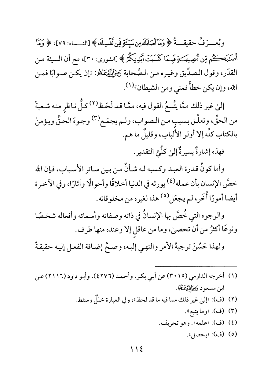 ويُعرَفُ حقيقةُ {وَمَا أَصَابَكَ مِنْ سَيِّئَةٍ فَمِنْ نَفْسِكَ} [النساء: ٧٩]، {وَمَا أَصَابَكُمْ مِنْ مُصِيبَةٍ فَبِمَا كَسَبَتْ أَيْدِيكُمْ} [الشورى: ٣٠]، مع أن السيئة من القدَر، وقول الصدِّيق وغيره من الصَّحابة - رضي الله عنهم -: "إن يكن صوابًا فمن الله، وإن يكن خطأً فمني ومن الشيطان" (¬١).