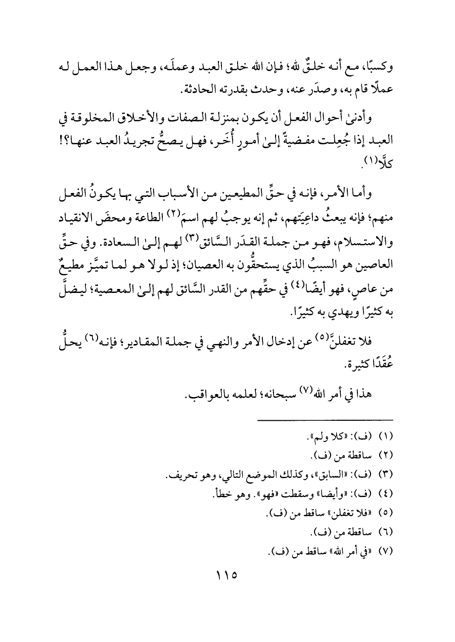 وأما الأمر، فإنه في حقِّ المطيعين من الأسباب التي بها يكونُ الفعل منهم؛ فإنه يبعثُ داعِيَتهم، ثم إنه يوجبُ لهم اسمَ (¬٢) الطاعة ومحضَ الانقياد والاستسلام، فهو من جملة القدَر السَّائق (¬٣) لهم إلى السعادة. وفي حقِّ العاصين هو السببُ الذي يستحقُّون به العصيان؛ إذ لولا هو لما تميَّز مطيعٌ من عاصٍ، فهو أيضًا (¬٤) في حقِّهم من القدر السَّائق لهم إلى المعصية؛ ليضلَّ به كثيرًا ويهدي به كثيرًا.