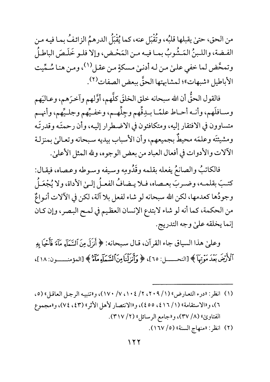 فالقول الحقُّ أن الله سبحانه خلق الخلقَ كلَّهم، أوَّلهم وآخرَهم، وعاليَهم وسافلَهم، وأنه أحاط علمًا بدِقِّهم وجِلِّهم، وخفيِّهم وجليِّهم، وأنهم متساوون في الافتقار إليه، ومتكافئون في الاضطرار إليه، وأن رحمتَه وقدرتَه ومشيئتَه وعلمَه محيطٌ بجميعهم، وأن الأسباب بيديه سبحانه وتعالى بمنزلة الآلات والأدوات في أفعال العباد من بعض الوجوه، ولله المثل الأعلى.