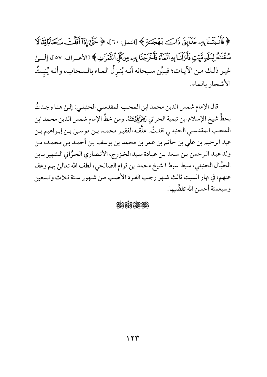 قال الإمام شمس الدين محمد ابن المحب المقدسي الحنبلي: إلى هنا وجدتُ بخطِّ شيخ الإسلام ابن تيمية الحراني - رضي الله عنه -. ومن خطِّ الإمام شمس الدين محمد ابن المحب المقدسي الحنبلي نقلتُ. علَّقه الفقير محمد بن موسى بن إبراهيم بن عبد الرحيم بن علي بن حاتم بن عمر بن محمد بن يوسف بن أحمد بن محمد, من ولد عبد الرحمن بن سعد بن عبادة سيد الخزرج, الأنصاري الحرَّاني الشهير بابن الحبَّال الحنبلي، سبط سبط الشيخ محمد بن قوام الصالحي، لطف الله تعالى بهم وعفا عنهم، في نهار السبت ثالث شهر رجب الفرد الأصب من شهور سنة ثلاث وتسعين وسبعمئة أحسن الله تقضِّيها.