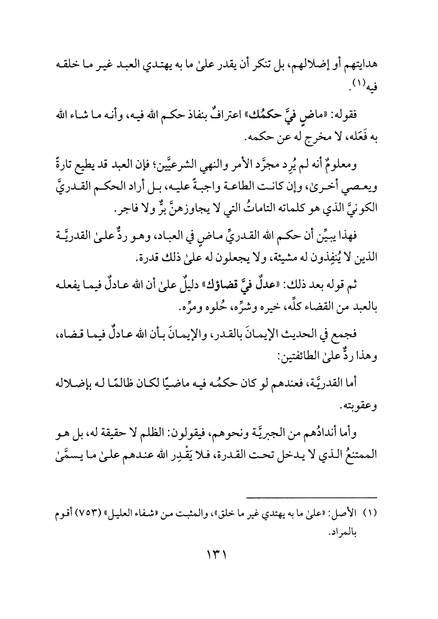 أما القدريَّة، فعندهم لو كان حكمُه فيه ماضيًا لكان ظالمًا له بإضلاله وعقوبته.