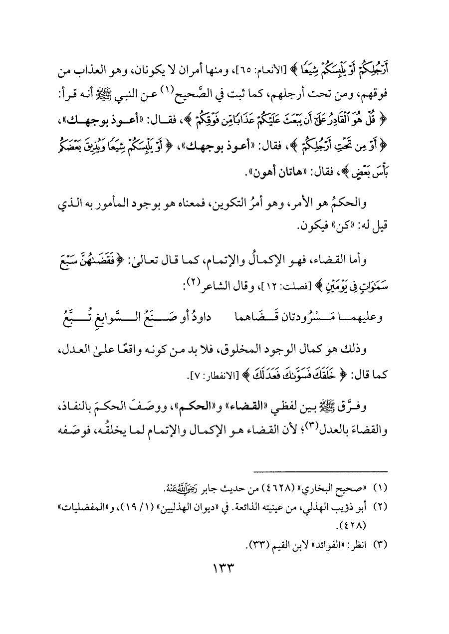 وفرَّق - صلى الله عليه وسلم - بين لفظي "القضاء" و"الحكم"، ووصَفَ الحكمَ بالنفاذ، والقضاءَ بالعدل (¬٣)؛ لأن القضاء هو الإكمال والإتمام لما يخلقُه، فوصَفه