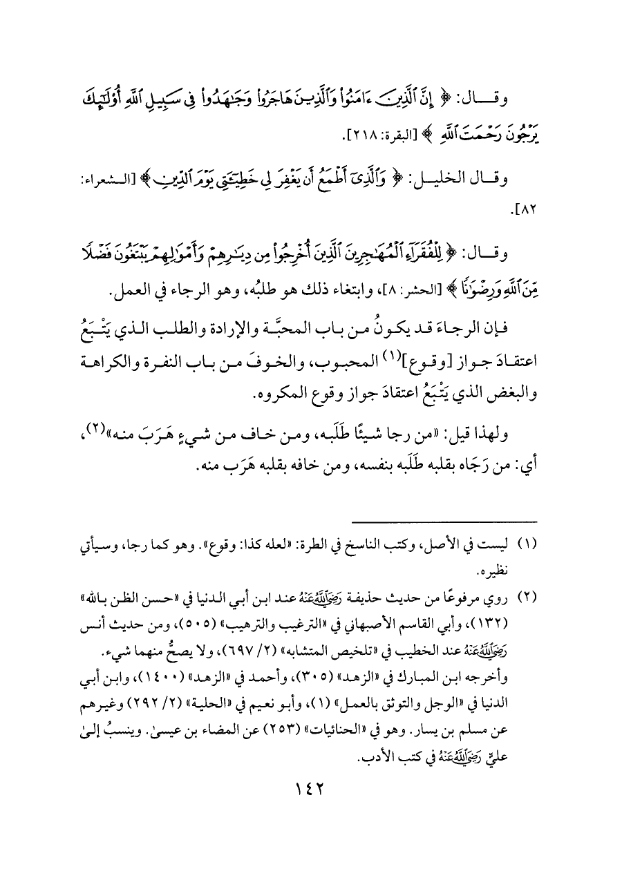 وقال: {إِنَّ الَّذِينَ آمَنُوا وَالَّذِينَ هَاجَرُوا وَجَاهَدُوا فِي سَبِيلِ اللَّهِ أُولَئِكَ يَرْجُونَ رَحْمَتَ اللَّهِ} [البقرة: ٢١٨].