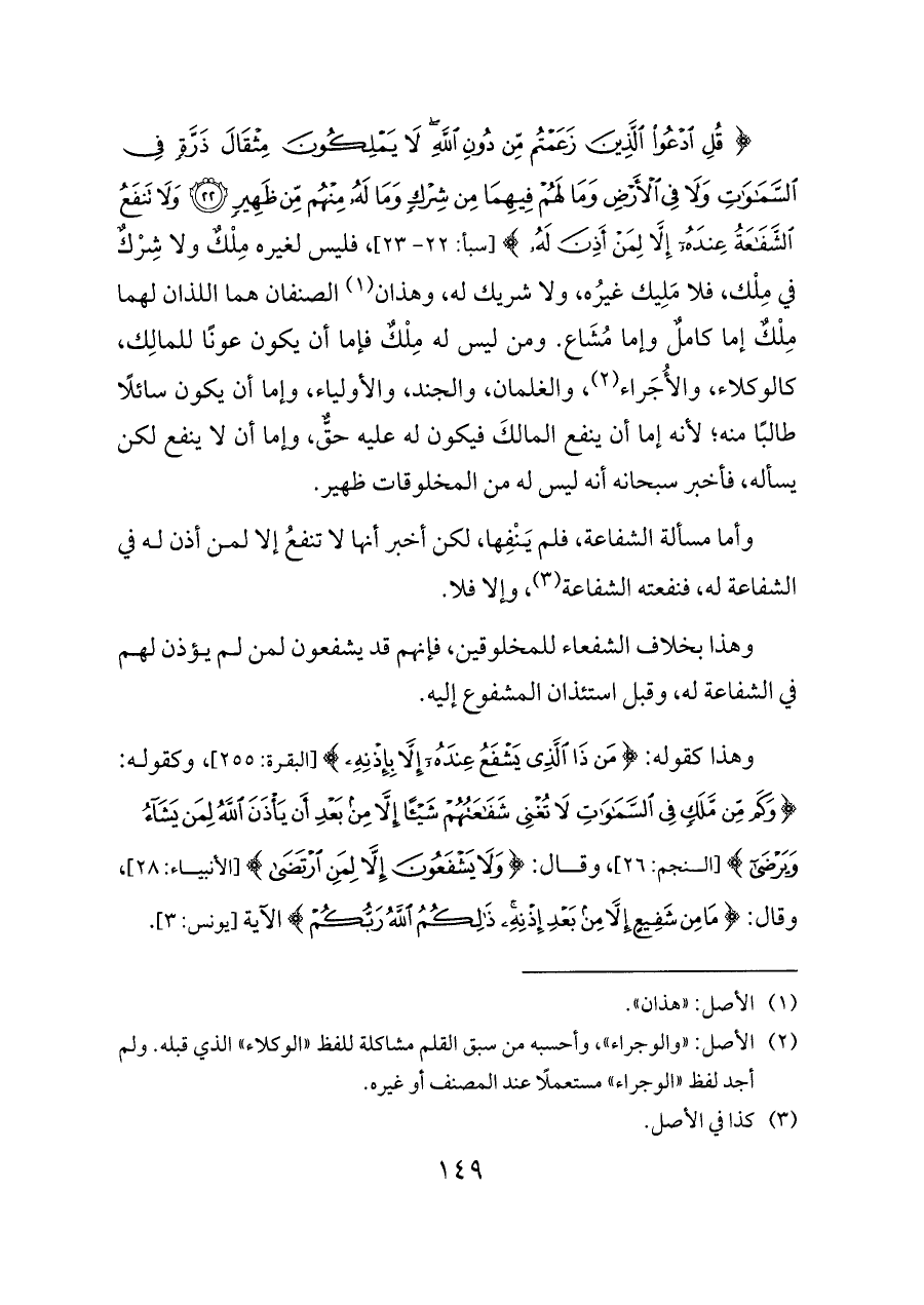 {قُلِ ادْعُوا الَّذِينَ زَعَمْتُمْ مِنْ دُونِ اللَّهِ لَا يَمْلِكُونَ مِثْقَالَ ذَرَّةٍ فِي السَّمَاوَاتِ وَلَا فِي الْأَرْضِ وَمَا لَهُمْ فِيهِمَا مِنْ شِرْكٍ وَمَا لَهُ مِنْهُمْ مِنْ ظَهِيرٍ (٢٢) وَلَا تَنْفَعُ الشَّفَاعَةُ عِنْدَهُ إِلَّا لِمَنْ أَذِنَ لَهُ} [سبأ: ٢٢ - ٢٣]، فليس لغيره مِلْكٌ ولا شِرْكٌ في مِلْك، فلا مَلِيك غيرُه، ولا شريك له، وهذان (¬١) الصنفان هما اللذان لهما مِلْكٌ إما كاملٌ وإما مُشَاع. ومن ليس له مِلْكٌ فإما أن يكون عونًا للمالِك، كالوكلاء، والأُجَراء (¬٢)، والغلمان، والجند، والأولياء، وإما أن يكون سائلًا طالبًا منه؛ لأنه إما أن ينفع المالكَ فيكون له عليه حقٌّ، وإما أن لا ينفع لكن يسأله، فأخبر سبحانه أنه ليس له من المخلوقات ظهير.