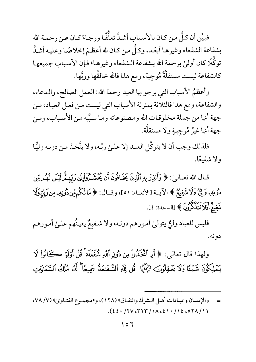 فبيَّن أن كلَّ من كان بالأسباب أشدَّ تعلُّقًا ورجاءً كان عن رحمة الله بشفاعة الشفعاء وغيرها أبعَد، وكلَّ من كان لله أعظمَ إخلاصًا وعليه أشدَّ توكُّلًا كان أولى برحمة الله بشفاعة الشفعاء وغيرها؛ فإن الأسباب جميعها كالشفاعة ليست مستقلَّةً مُوجِبة، ومع هذا فالله خالقُها وربُّها.