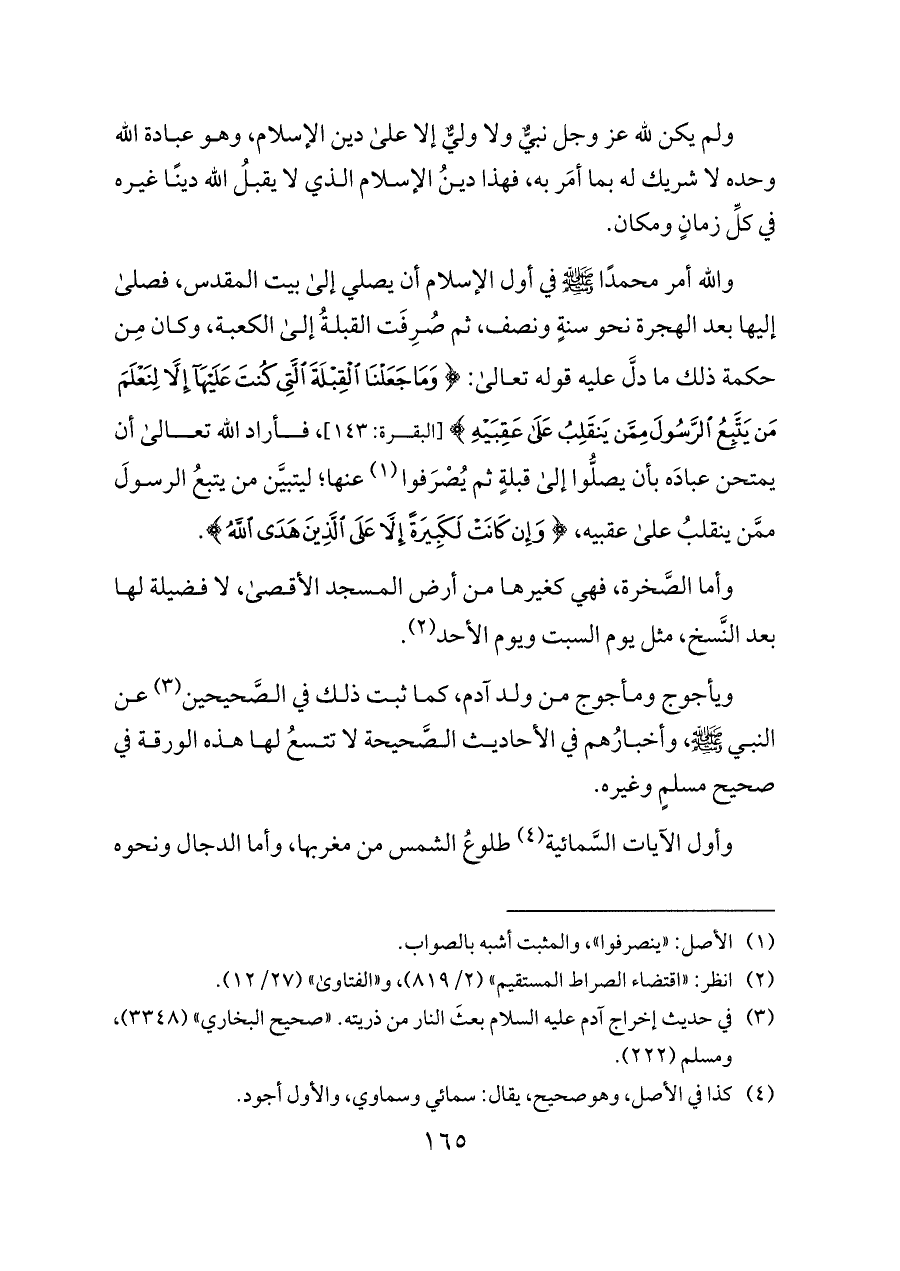 والله أمر محمدًا - صلى الله عليه وسلم - في أول الإسلام أن يصلي إلى بيت المقدس، فصلى إليها بعد الهجرة نحو سنةٍ ونصف، ثم صُرِفَت القبلةُ إلى الكعبة، وكان مِن حكمة ذلك ما دلَّ عليه قوله تعالى: {وَمَا جَعَلْنَا الْقِبْلَةَ الَّتِي كُنْتَ عَلَيْهَا إِلَّا لِنَعْلَمَ مَنْ يَتَّبِعُ الرَّسُولَ مِمَّنْ يَنْقَلِبُ عَلَى عَقِبَيْهِ} [البقرة: ١٤٣] , فأراد الله تعالى أن يمتحن عبادَه بأن يصلُّوا إلى قبلةٍ ثم يُصْرَفوا (¬١) عنها؛ ليتبيَّن من يتبعُ الرسولَ ممَّن ينقلبُ على عقبيه، {وَإِنْ كَانَتْ لَكَبِيرَةً إِلَّا عَلَى الَّذِينَ هَدَى اللَّهُ}.