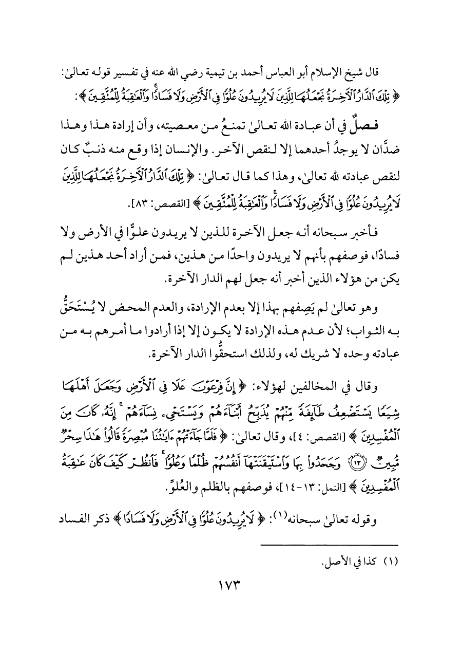 قال شيخ الإسلام أبو العباس أحمد بن تيمية رضي الله عنه في تفسير قوله تعالى: {تِلْكَ الدَّارُ الْآخِرَةُ نَجْعَلُهَا لِلَّذِينَ لَا يُرِيدُونَ عُلُوًّا فِي الْأَرْضِ وَلَا فَسَادًا وَالْعَاقِبَةُ لِلْمُتَّقِينَ}:
