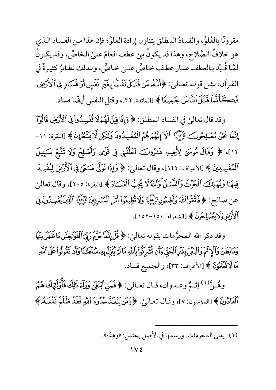 مقرونًا بالعُلوِّ, والفسادُ المطلق يتناول إرادة العلوِّ؛ فإن هذا من الفساد الذي هو خلافُ الصَّلاح, وهذا قد يكونُ مِن عطف العامِّ على الخاصِّ, وقد يكونُ لمَّا قُيِّد بالعطف صار عطف خاصٍّ على خاصٍّ, ولذلك نظائرُ كثيرةٌ في القرآن, مثل قوله تعالى: {أَنَّهُ مَنْ قَتَلَ نَفْسًا بِغَيْرِ نَفْسٍ أَوْ فَسَادٍ فِي الْأَرْضِ فَكَأَنَّمَا قَتَلَ النَّاسَ جَمِيعًا} [المائدة: ٣٢] , وقتل النفس أيضًا فساد.