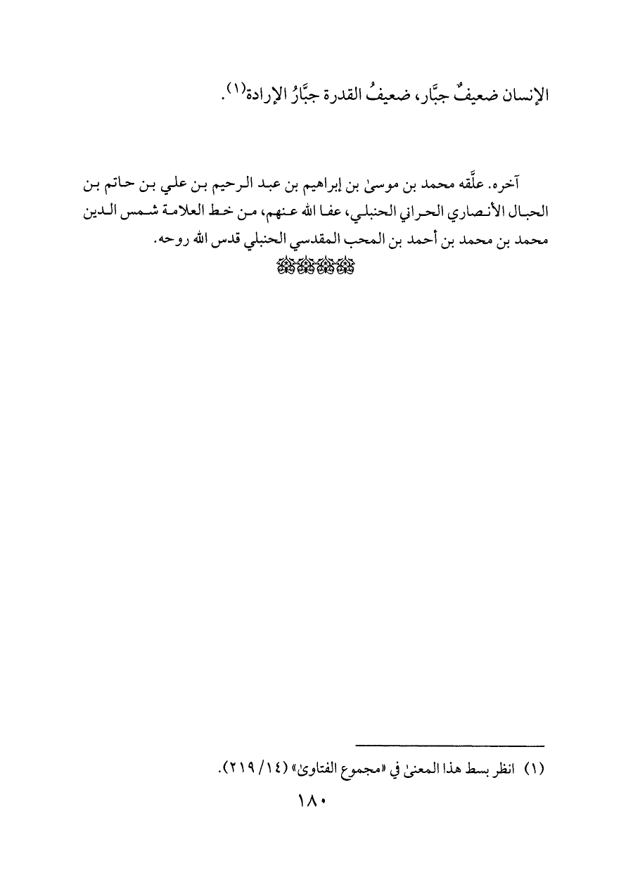 آخره. علَّقه محمد بن موسى بن إبراهيم بن عبد الرحيم بن علي بن حاتم بن الحبال الأنصاري الحراني الحنبلي، عفا الله عنهم، من خط العلامة شمس الدين محمد بن محمد بن أحمد بن المحب المقدسي الحنبلي قدس الله روحه.