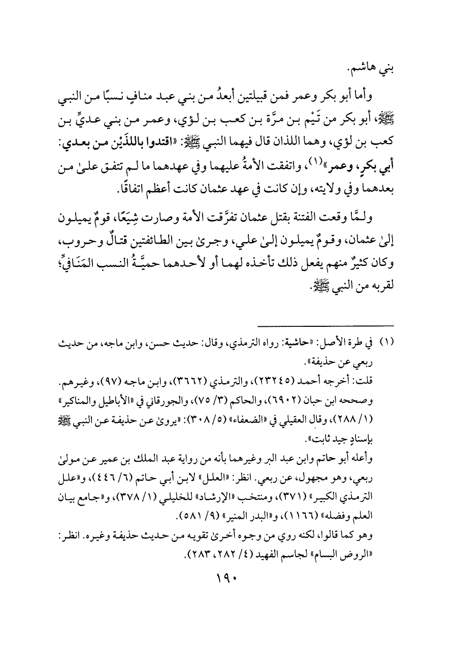 وأما أبو بكر وعمر فمن قبيلتين أبعدُ من بني عبد منافٍ نسبًا من النبي - صلى الله عليه وسلم -، أبو بكر من تَيْم بن مرَّة بن كعب بن لؤي، وعمر من بني عديِّ بن كعب بن لؤي، وهما اللذان قال فيهما النبي - صلى الله عليه وسلم -: "اقتدوا باللذَيْن من بعدي: أبي بكرٍ، وعمر" (¬١)،
