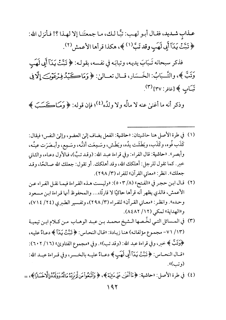(¬٣) في المسائل التي لخَّصها الشيخ محمد بن عبد الوهاب من كلام ابن تيمية (١٣/ ٧١ - مجموع مؤلفاته) هنا زيادة: "قال النحاس: {تَبَّتْ يَدَا} دعاءٌ عليه، {وَتَبَّ} خبر، وفي قراءة عبد الله: (وقد تب) ". وفي "مجموع الفتاوى" (١٦/ ٦٠٢): "قال النحاس: {تَبَّتْ يَدَا أَبِي لَهَبٍ} دعاءٌ عليه بالخسر، وفي قراءة عبد الله: (وتب) ".