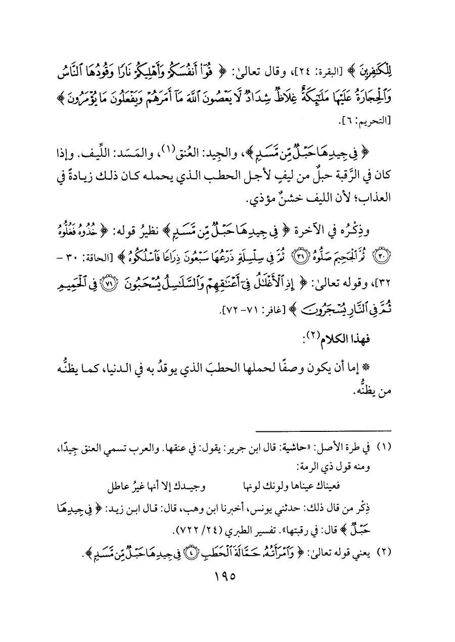 (¬٢) يعني قوله تعالى: {وَامْرَأَتُهُ حَمَّالَةَ الْحَطَبِ (٤) فِي جِيدِهَا حَبْلٌ مِنْ مَسَدٍ}.