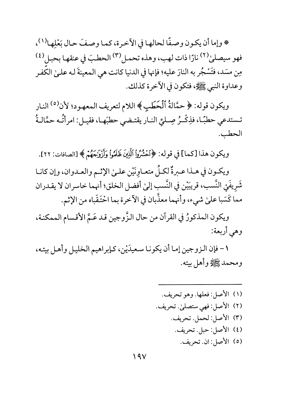 * وإما أن يكون وصفًا لحالها في الآخرة، كما وصفَ حال بَعْلِها (¬١)، فهو سيصلى (¬٢) نارًا ذات لهب، وهذه تحمل (¬٣) الحطبَ في عنقها بحبلٍ (¬٤) مِن مسَد، فتَسْجُر به النارَ عليه؛ فإنها في الدنيا كانت هي المعينةَ له على الكفر وعداوة النبي - صلى الله عليه وسلم -، فتكون في الآخرة كذلك.
