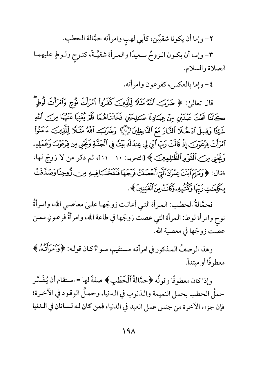 فحمَّالةُ الحطب: المرأة التي أعانت زوجَها على معاصي الله، وامرأةُ نوحٍ وامرأة لوط: المرأة التي عصت زوجَها في طاعة الله، وامرأةُ فرعونٍ ممن عصت زوجَها في معصية الله.