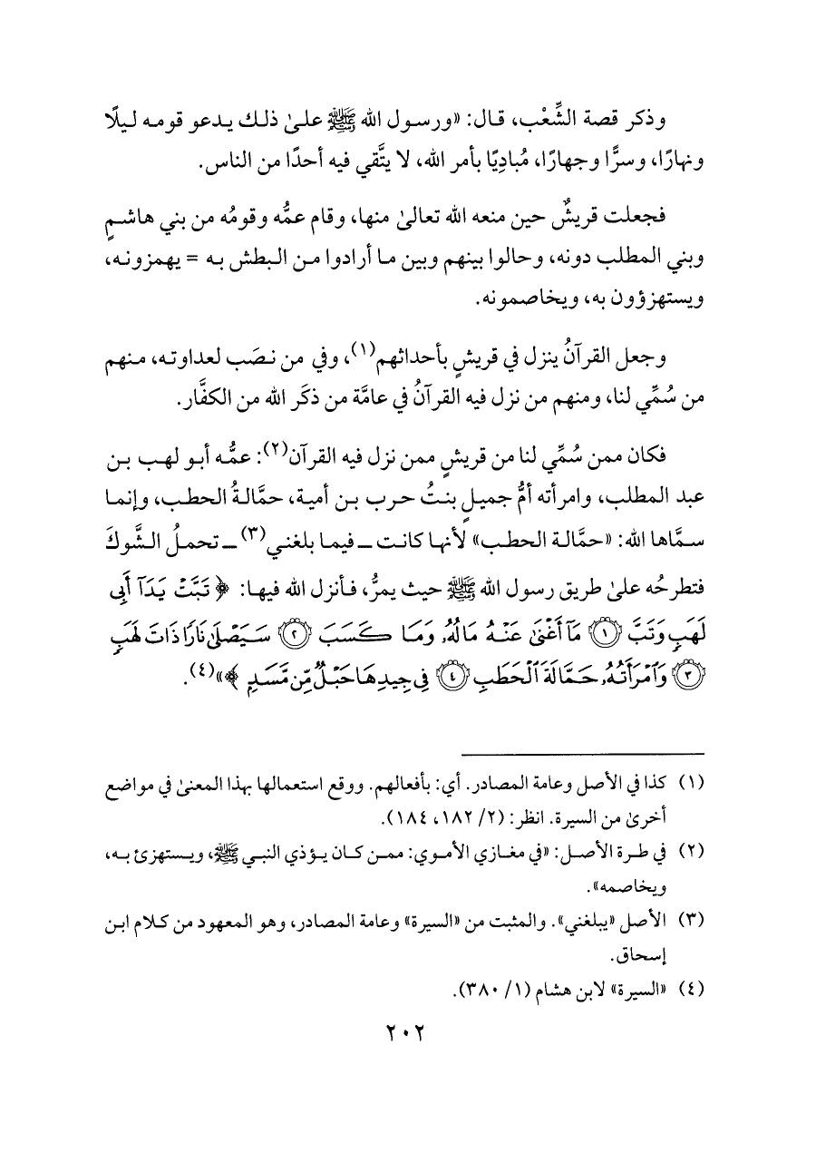 فكان ممن سُمِّي لنا من قريشٍ ممن نزل فيه القرآن (¬٢): عمُّه أبو لهب بن عبد المطلب، وامرأته أمُّ جميلٍ بنتُ حرب بن أمية، حمَّالةُ الحطب، وإنما سمَّاها الله: "حمَّالة الحطب" لأنها كانت ــ فيما بلغني (¬٣) ــ تحملُ الشَّوكَ فتطرحُه على طريق رسول الله - صلى الله عليه وسلم - حيث يمرُّ، فأنزل الله فيها: {تَبَّتْ يَدَا أَبِي لَهَبٍ وَتَبَّ (١) مَا أَغْنَى عَنْهُ مَالُهُ وَمَا كَسَبَ (٢) سَيَصْلَى نَارًا ذَاتَ لَهَبٍ (٣) وَامْرَأَتُهُ حَمَّالَةَ الْحَطَبِ (٤) فِي جِيدِهَا حَبْلٌ مِنْ مَسَدٍ} " (¬٤).