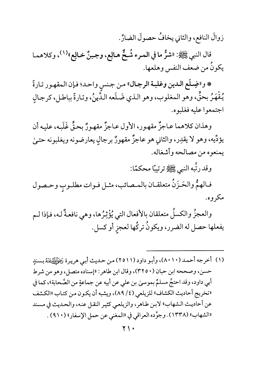 * و"ضِلَع الدين وغلبة الرجال" من جنسٍ واحد؛ فإن المقهور تارةً يُقْهَرُ بحقٍّ، وهو المغلوب، وهو الذي ضَلَعه الدَّينُ، وتارةً بباطل، كرجالٍ اجتمعوا عليه فغلبوه.