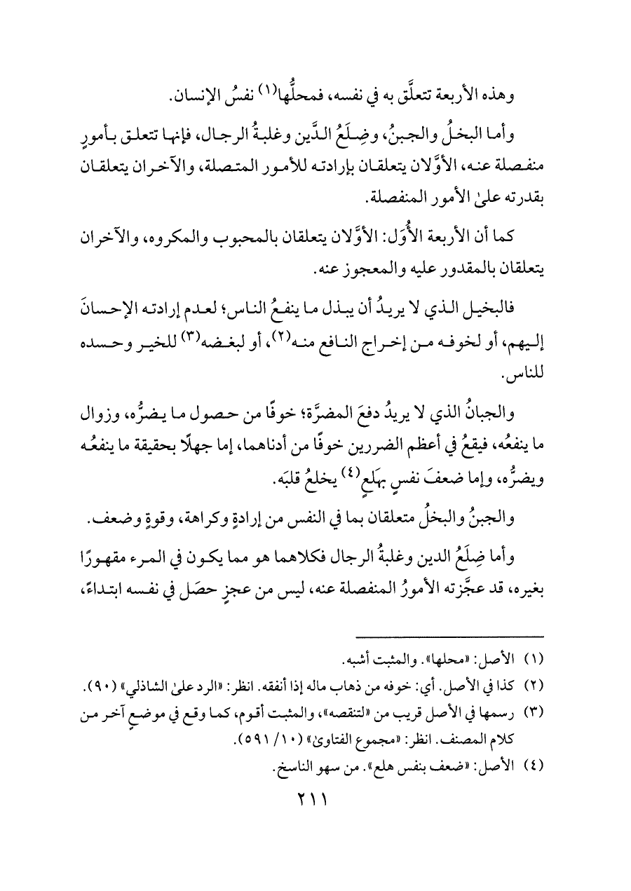 وأما البخلُ والجبنُ، وضِلَعُ الدَّين وغلبةُ الرجال، فإنها تتعلق بأمورٍ منفصلة عنه، الأوَّلان يتعلقان بإرادته للأمور المتصلة، والآخران يتعلقان بقدرته على الأمور المنفصلة.