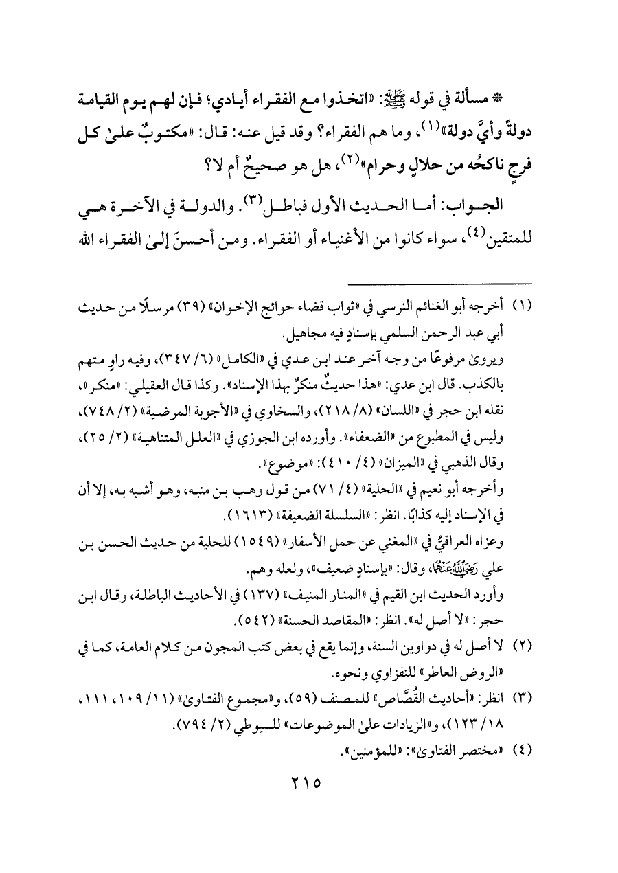 الجواب: أما الحديث الأول فباطل (¬٣). والدولة في الآخرة هي للمتقين (¬٤)، سواء كانوا من الأغنياء أو الفقراء. ومن أحسنَ إلى الفقراء الله