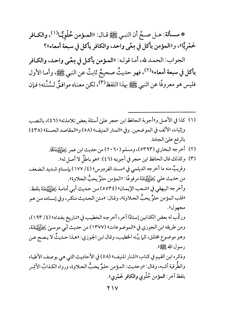 * مسألة: هل صحَّ أن النبي - صلى الله عليه وسلم - قال: "المؤمن حُلْوِيًّا (¬١)، والكافر خَمْرِيًّا"، و "المؤمن يأكل في مِعًى واحد، والكافر يأكل في سبعة أمعاء"؟