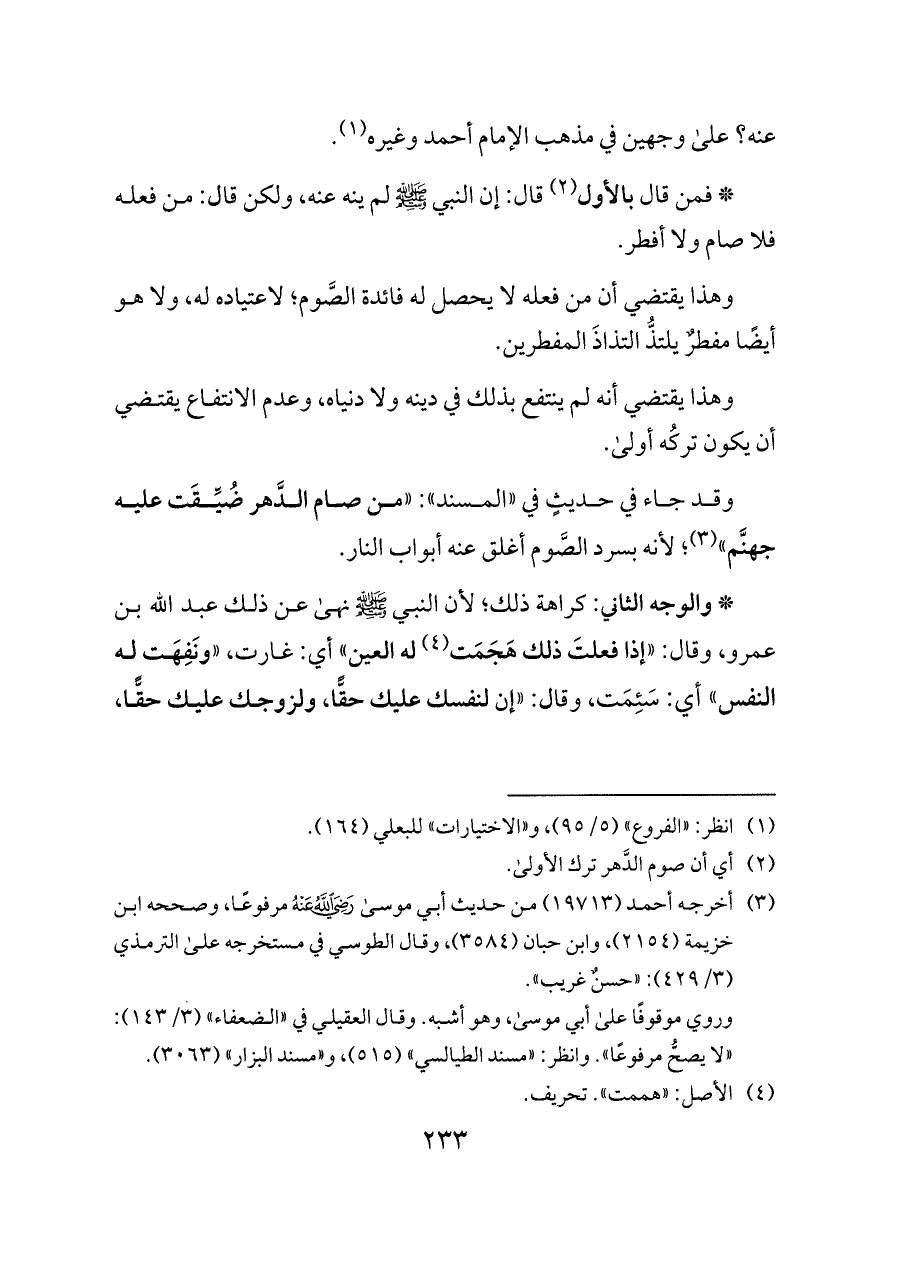 * والوجه الثاني: كراهة ذلك؛ لأن النبي - صلى الله عليه وسلم - نهى عن ذلك عبد الله بن عمرو، وقال: "إذا فعلتَ ذلك هَجَمَت (¬٤) له العين" أي: غارت، "ونَفِهَت له النفس" أي: سَئِمَت، وقال: "إن لنفسك عليك حقًّا، ولزوجك عليك حقًّا،