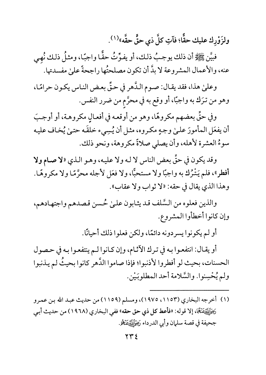 (¬١) أخرجه البخاري (١١٥٣، ١٩٧٥)، ومسلم (١١٥٩) من حديث عبد الله بن عمرو - رضي الله عنهما -، إلا قوله: "فأعط كل ذي حق حقه" ففي البخاري (١٩٦٨) من حديث أبي جحيفة في قصة سلمان وأبي الدرداء - رضي الله عنهم -.