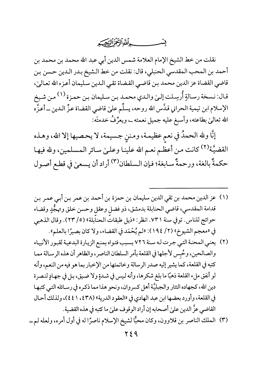 نقلت من خط الشيخ الإمام العلامة شمس الدين أبي عبد الله محمد بن محمد بن أحمد بن المحب المقدسي الحنبلي، قال: نقلت من خط الشيخ بدر الدين حسن بن قاضي القضاة عز الدين محمد بن قاضي القضاة تقي الدين سليمان أعزه الله تعالى، قال: نسخة رسالةٍ أُرسِلت إلى والدي محمد بن سليمان بن حمزة (¬١) من شيخ الإسلام ابن تيمية الحراني قدَّس الله روحه، يسلِّم على قاضي القضاة عزِّ الدين ــ أعزَّه الله تعالى بطاعته، وأسبغ عليه جميل نعمته ــ، ويعرِّفُ خدمتَه: