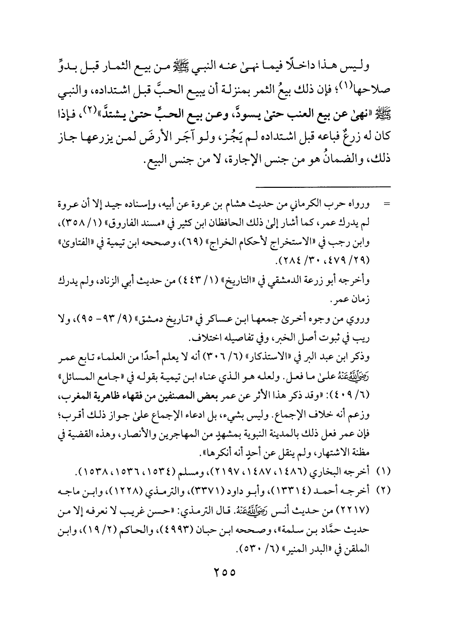 وليس هذا داخلًا فيما نهى عنه النبي - صلى الله عليه وسلم - من بيع الثمار قبل بدوِّ صلاحها (¬١)؛ فإن ذلك بيعُ الثمر بمنزلة أن يبيع الحبَّ قبل اشتداده، والنبي - صلى الله عليه وسلم - "نهى عن بيع العنب حتى يسودَّ، وعن بيع الحبِّ حتى يشتدَّ" (¬٢)، فإذا كان له زرعٌ فباعه قبل اشتداده لم يَجُز, ولو آجَر الأرضَ لمن يزرعها جاز ذلك، والضمانُ هو من جنس الإجارة، لا من جنس البيع.