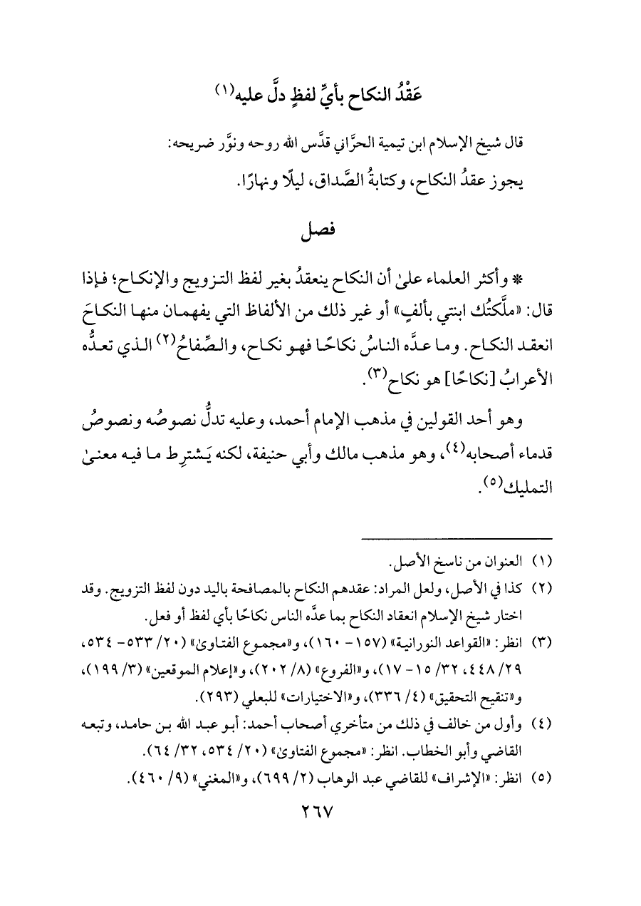 (¬٢) كذا في الأصل، ولعل المراد: عقدهم النكاح بالمصافحة باليد دون لفظ التزويج. وقد اختار شيخ الإسلام انعقاد النكاح بما عدَّه الناس نكاحًا بأي لفظ أو فعل.