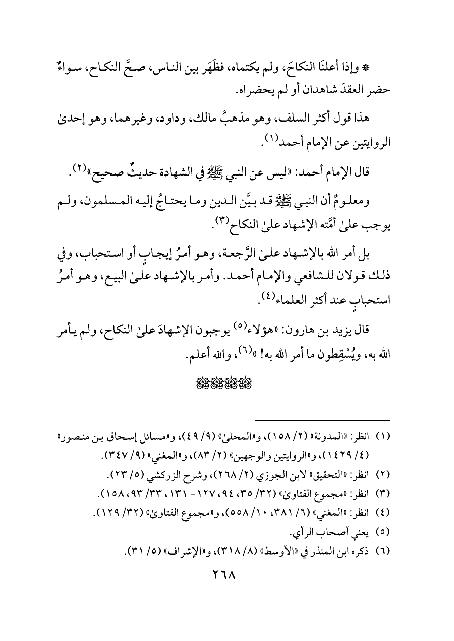 قال يزيد بن هارون: "هؤلاء (¬٥) يوجبون الإشهادَ على النكاح، ولم يأمر الله به، ويُسْقِطون ما أمر الله به! " (¬٦)، والله أعلم.