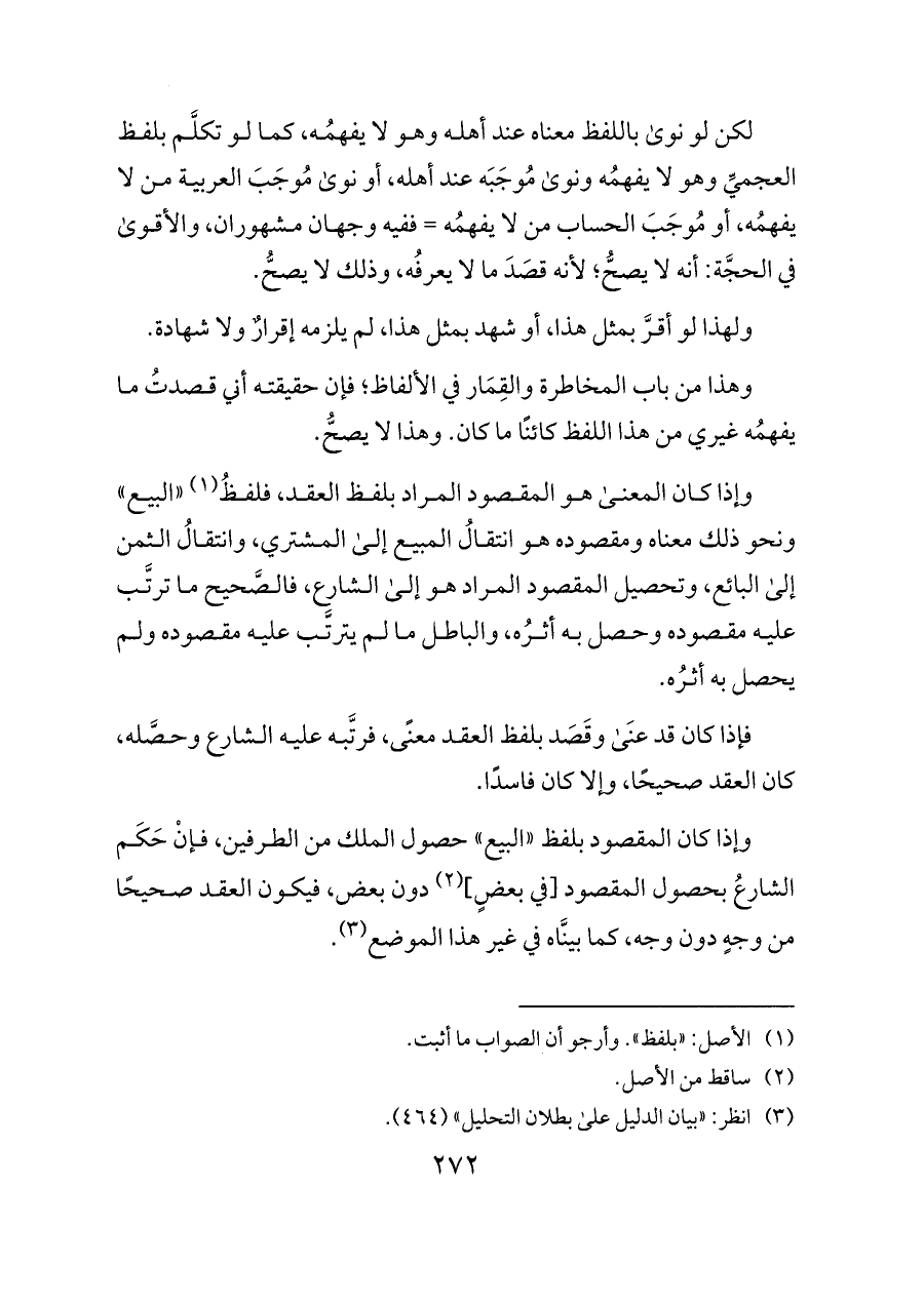 فإذا كان قد عنَى وقَصَد بلفظ العقد معنًى، فرتَّبه عليه الشارع وحصَّله، كان العقد صحيحًا، وإلا كان فاسدًا.