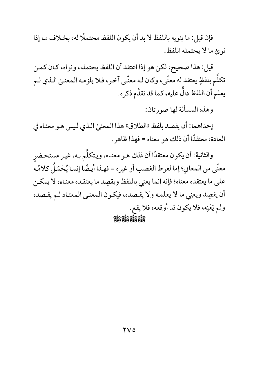 والثانية: أن يكون معتقدًا أن ذلك هو معناه، ويتكلَّم به، غير مستحضرٍ معنًى من المعاني؛ إما لفرط الغضب أو غيره = فهذا أيضًا إنما يُحْمَلُ كلامُه على ما يعتقده معناه؛ فإنه إنما يعنِي باللفظ ويقصِد ما يعتقده معناه، لا يمكن أن يقصِد ويعنِي ما لا يعلمه ولا يقصده، فيكون المعنى المعتاد لم يقصده ولم يَعْنِه، فلا يكون قد أوقعه، فلا يقع.