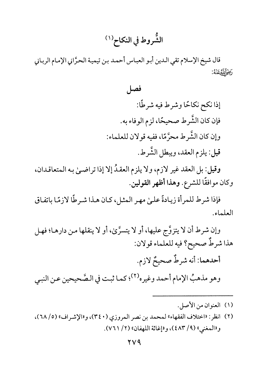 وإن شرط أن لا يتزوَّج عليها، أو لا يتسرَّى، أو لا ينقلها من دارها؛ فهل هذا شرطٌ صحيح؟ فيه للعلماء قولان:
