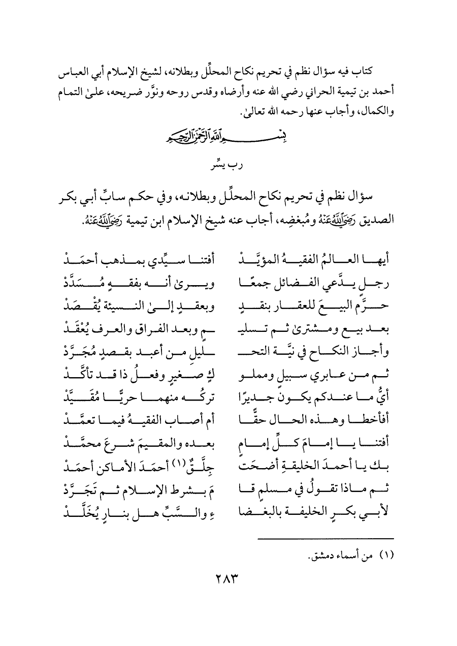 كتاب فيه سؤال نظم في تحريم نكاح المحلِّل وبطلانه، لشيخ الإسلام أبي العباس أحمد بن تيمية الحراني رضي الله عنه وأرضاه وقدس روحه ونوَّر ضريحه، على التمام والكمال، وأجاب عنها رحمه الله تعالى.