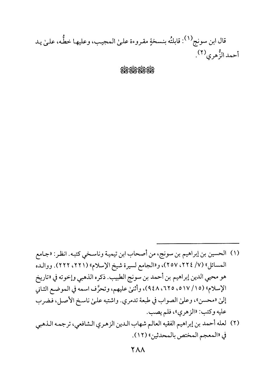 (¬١) الحسين بن إبراهيم بن سونج، من أصحاب ابن تيمية وناسخي كتبه. انظر: "جامع المسائل" (٧/ ٢٢٤, ٢٥٧) , و"الجامع لسيرة شيخ الإسلام" (٢٢١, ٢٢٢). ووالده هو محيي الدين إبراهيم بن أحمد بن سونج الطبيب. ذكره الذهبي وإخوته في "تاريخ الإسلام" (١٥/ ٥١٧, ٦٢٥, ٩٤٨)، وأثنى عليهم, وتحرَّف اسمه في الموضع الثاني إلى "محسن", وعلى الصواب في طبعة تدمري. واشتبه على ناسخ الأصل، فضرب عليه وكتب: "الزهري"، فلم يصب.