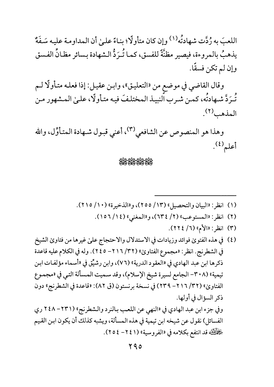 اللعبَ به رُدَّت شهادتُه (¬١) وإن كان متأولًا؛ بناءً على أن المداومة عليه سَفَهٌ يذهبُ بالمروءة، فيصير مظنَّةً للفسق، كما تُرَدُّ الشهادة بسائر مظانِّ الفسق وإن لم تكن فسقًا.