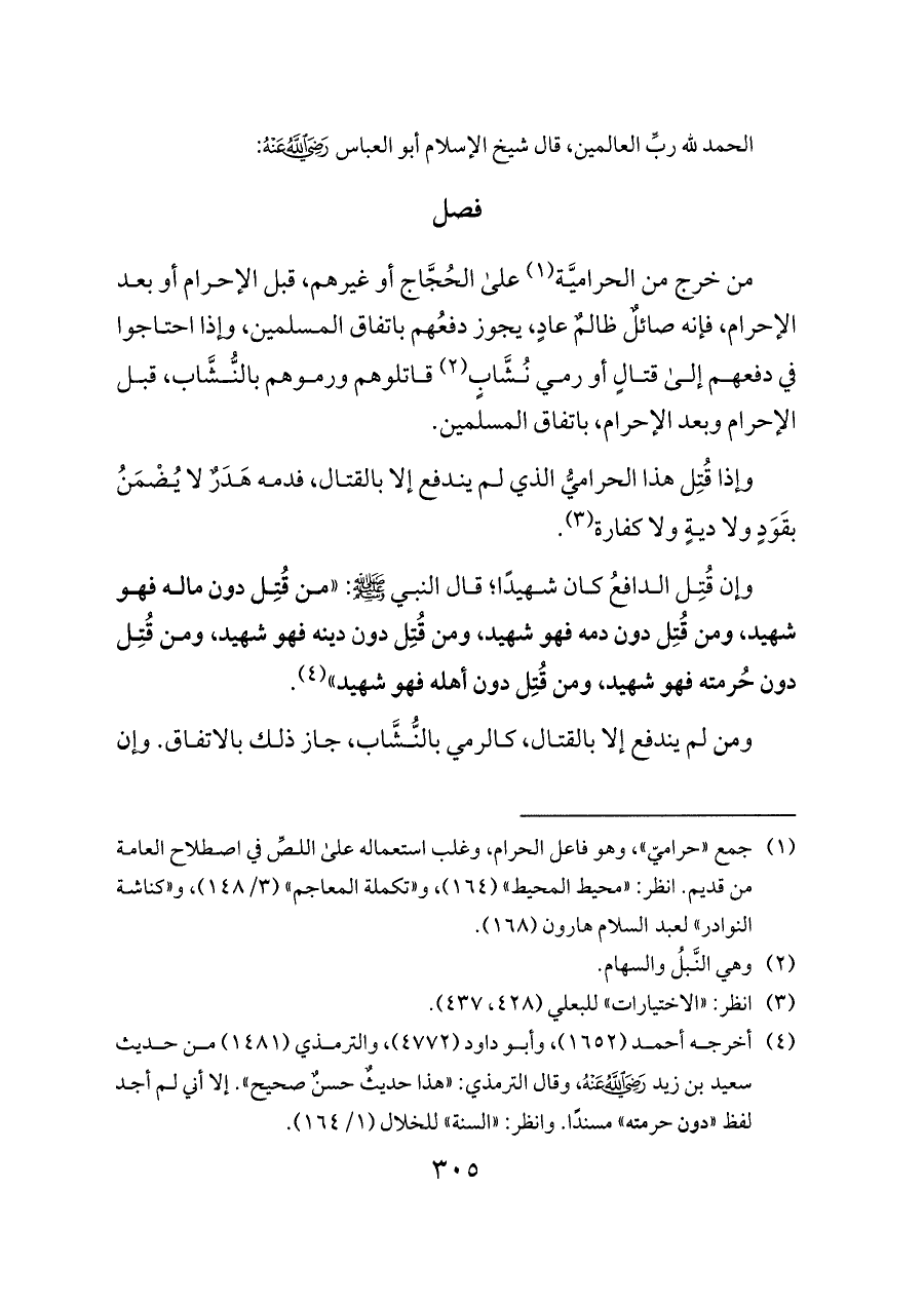 من خرج من الحراميَّة (¬١) على الحُجَّاج أو غيرهم، قبل الإحرام أو بعد الإحرام، فإنه صائلٌ ظالمٌ عادٍ، يجوز دفعُهم باتفاق المسلمين، وإذا احتاجوا في دفعهم إلى قتالٍ أو رمي نُشَّابٍ (¬٢) قاتلوهم ورموهم بالنُّشَّاب، قبل الإحرام وبعد الإحرام، باتفاق المسلمين.
