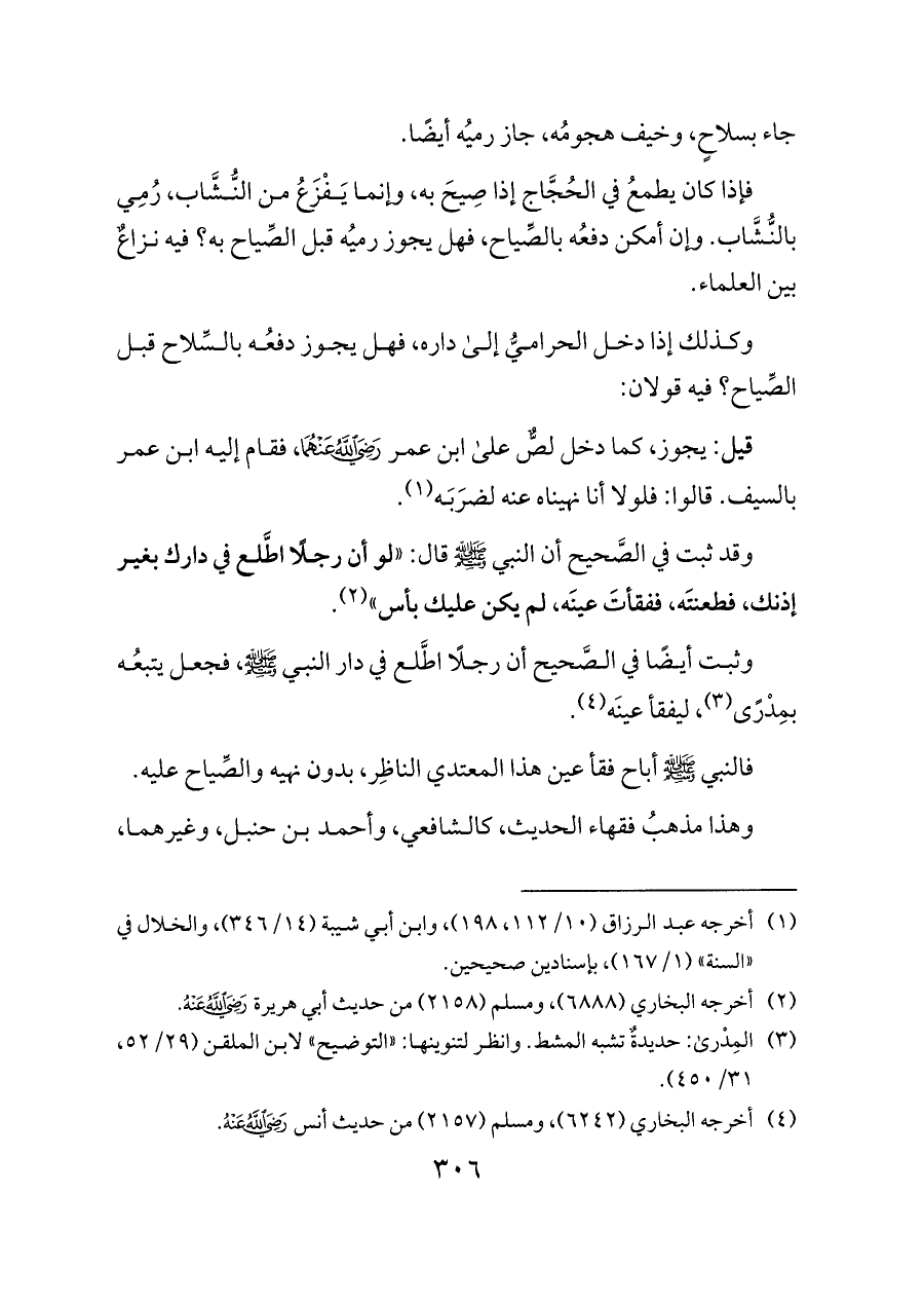 فإذا كان يطمعُ في الحُجَّاج إذا صِيحَ به، وإنما يَفْزَعُ من النُّشَّاب، رُمِي بالنُّشَّاب. وإن أمكن دفعُه بالصِّياح، فهل يجوز رميُه قبل الصِّياح به؟ فيه نزاعٌ بين العلماء.