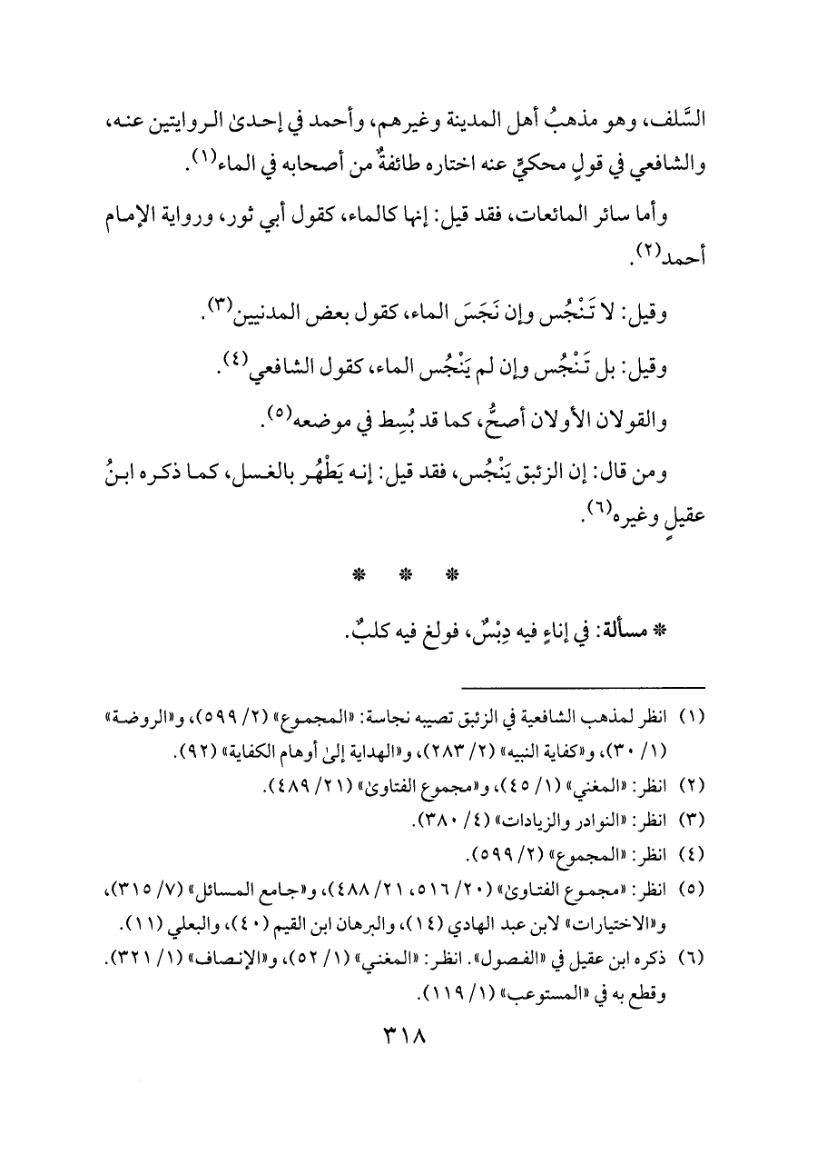 السَّلف، وهو مذهبُ أهل المدينة وغيرهم، وأحمد في إحدى الروايتين عنه، والشافعي في قولٍ محكيٍّ عنه اختاره طائفةٌ من أصحابه في الماء (¬١).