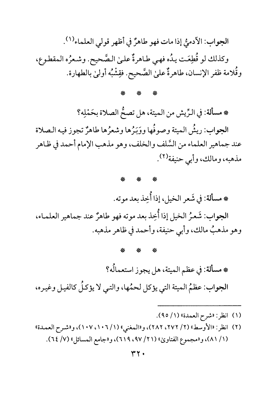 الجواب: ريشُ الميتة وصوفُها ووَبَرُها وشعرُها طاهرٌ تجوز فيه الصلاة عند جماهير العلماء من السَّلف والخلف، وهو مذهب الإمام أحمد في ظاهر مذهبه، ومالك، وأبي حنيفة (¬٢).